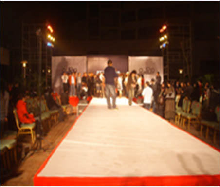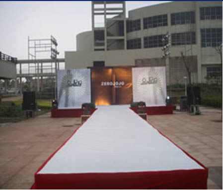 會場風格選用服裝秀常用的T型舞臺,長度:18米,燈光用成像燈,成像燈可讓服裝不變色彩,可保服裝的原色,讓客戶看到服裝的效果,加深客戶所看到的效果和簽單。